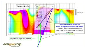 Results to date, including an increase in the number of porphyritic dykes downhole in prior drilling and a general broadening with depth of the geophysical (IP and CSAMT) responses, suggest good potential for system continuity and strengthening with depth. Proposed hole DEM25-06 (see Figures 1 and 3) will therefore be drilled from the same pad as DEM23-03, which was left in place, but at a steeper inclination (minus 70 degrees), targeting approximately 200 metres vertically below the intersection achieved in DEM23-03, for a projected length of approximately 600 metres. The key goals for this hole will be to demonstrate system continuity to depth, and to determine the orientation, widths and grade of any mineralized structures. Results will guide future drilling.